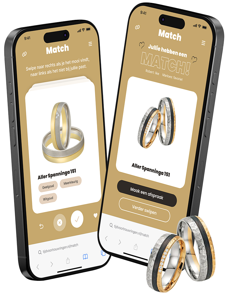 Onze Match-module maakt het kiezen van trouwringen leuk en eenvoudig. Swipe door de ringen, geef aan wat je leuk vindt en ontdek welke ringen perfect bij jullie passen. Zo ontstaat vanzelf een persoonlijke selectie, zonder keuzestress.